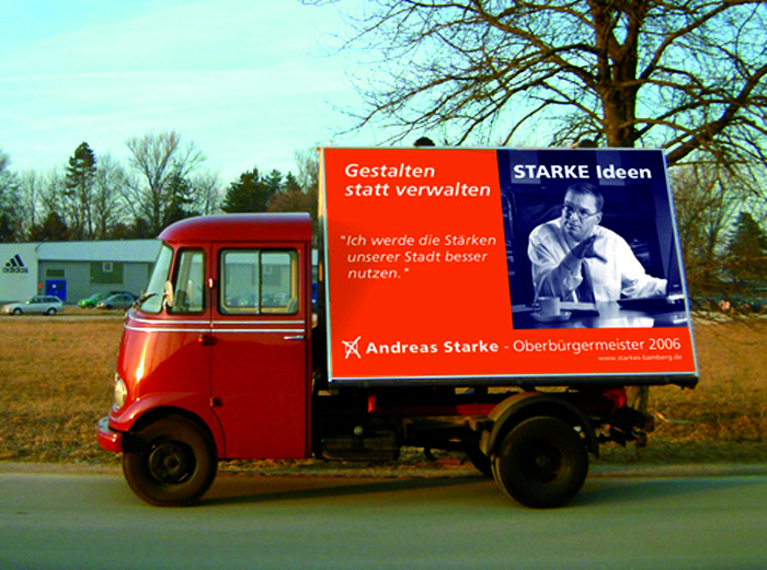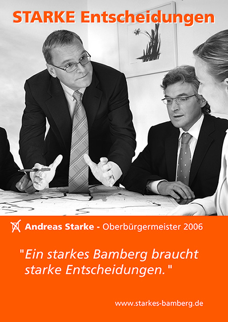Für Herrn Starke arrangierte und betreute unsere Werbeagentur die komplette Wahlkampange als Oberbürgermeisterkandidaten für Bamberg. Hierzu zählte die Ideenfindung, Claims, Grafikdesign, Mediaplanung sowie alle grafischen Medien die wir mit großer Konsequenz und sehr erfolgreich umsetzten. Mit unserer Strategie ist es uns gelungen erstmals in Bamberg einen nicht CSU-Kandidaten ins Rathaus zu bringen.