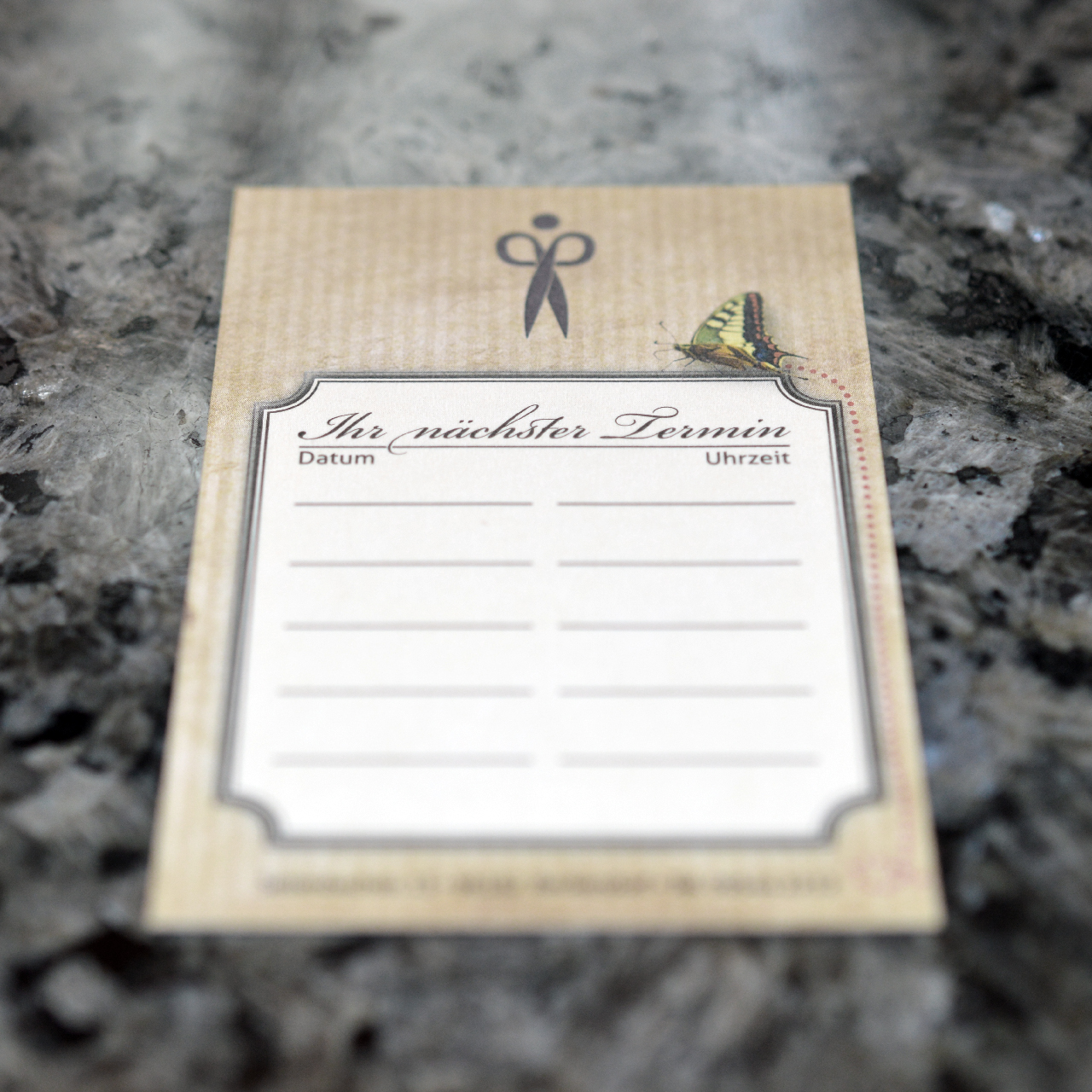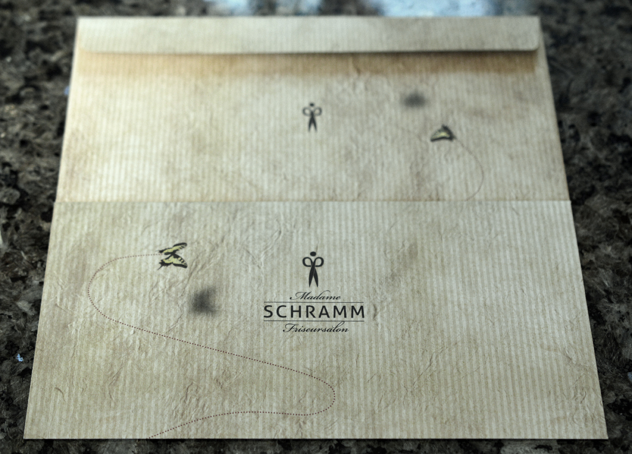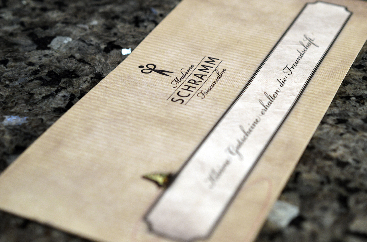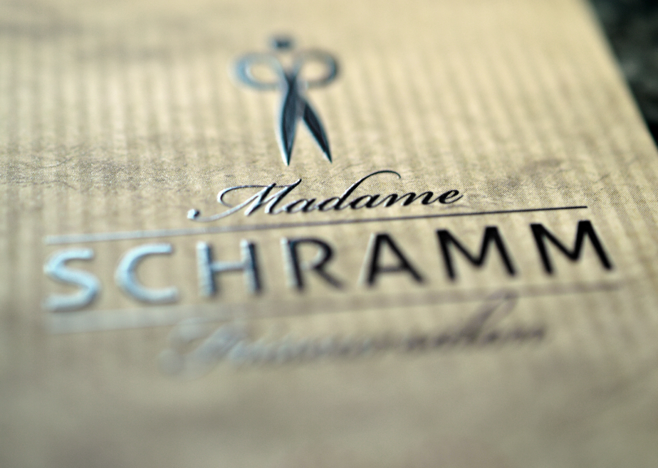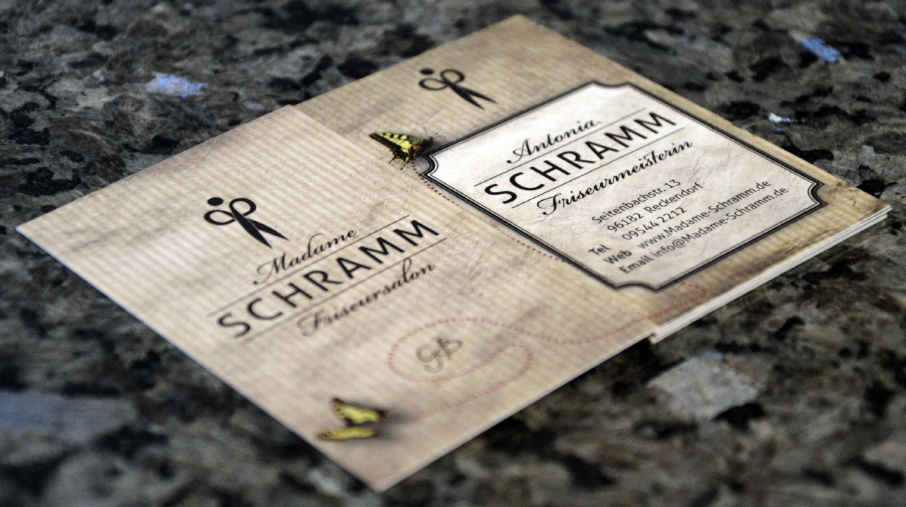 Für den Friseursalon Madame Schramm wurde von der Werbegantur Zensys ein ganzheitliches Corporate Design entwickelt, welches ein Lebensgefühl im modernen Vintage-Look widerspiegelt. Das Corporate Logo wurde in der Bildsprache auf das Thema „Friseur“ und dem Wording „Madame Schramm“ im wahrsten Sinne des Wortes zugeschnitten. Als Key-Visual wurde zusätzlich der Schmetterling in das Corporate Design integriert, welcher eine gewisse Dynamik einbringt und das Lebensgefühl der Inhaberin zeigt. Auch bei den Medien und den verwenden Materialien, wie z.B. bei den Visitenkarten, wurde darauf geachtet, dass bereits bei ersten Kontakt durch die Haptik das entsprechende Lebensgefühl vermittelt wird. Daher wurden die Visitenkarten mit einer sog. Softtouchfolie versehen und wichtige Designelemente wie Logo und Key-Visual durch eine partielle UV-Lackierung vor dem Hintergrund hervorgehoben. Dadurch fühlt man sich bereits beim ersten und wichtigsten Kontakt mit Madame Schramm wohlig und gut aufgehoben.