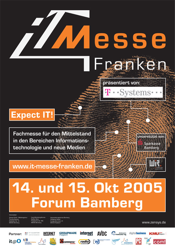 Die IT-Messe Franken ist mit über 100 Ausstellern eine der größten regionalen Fachmessen Frankens für Informationstechnologie und neue Medien. Im Jahr 2005 besuchten wiederum über 2.000 Fachbesucher die Veranstaltung, um sich über das Angebot der sowohl regional als auch überregionale agierenden Unternehmen zu informieren. Wir haben hierfür sämtliche werbliche Maßnahmen und Mittel erarbeitet, umgesetzt und dokumentiert. Außerdem wurde neben den Marketingmaßnahmen auch die Pressearbeit in Zusammenarbeit mit mehreren regionalen und überregionalen Zeitungen, Fenseh- und Radiosendern und Journalen sehr erfolgreich geleistet