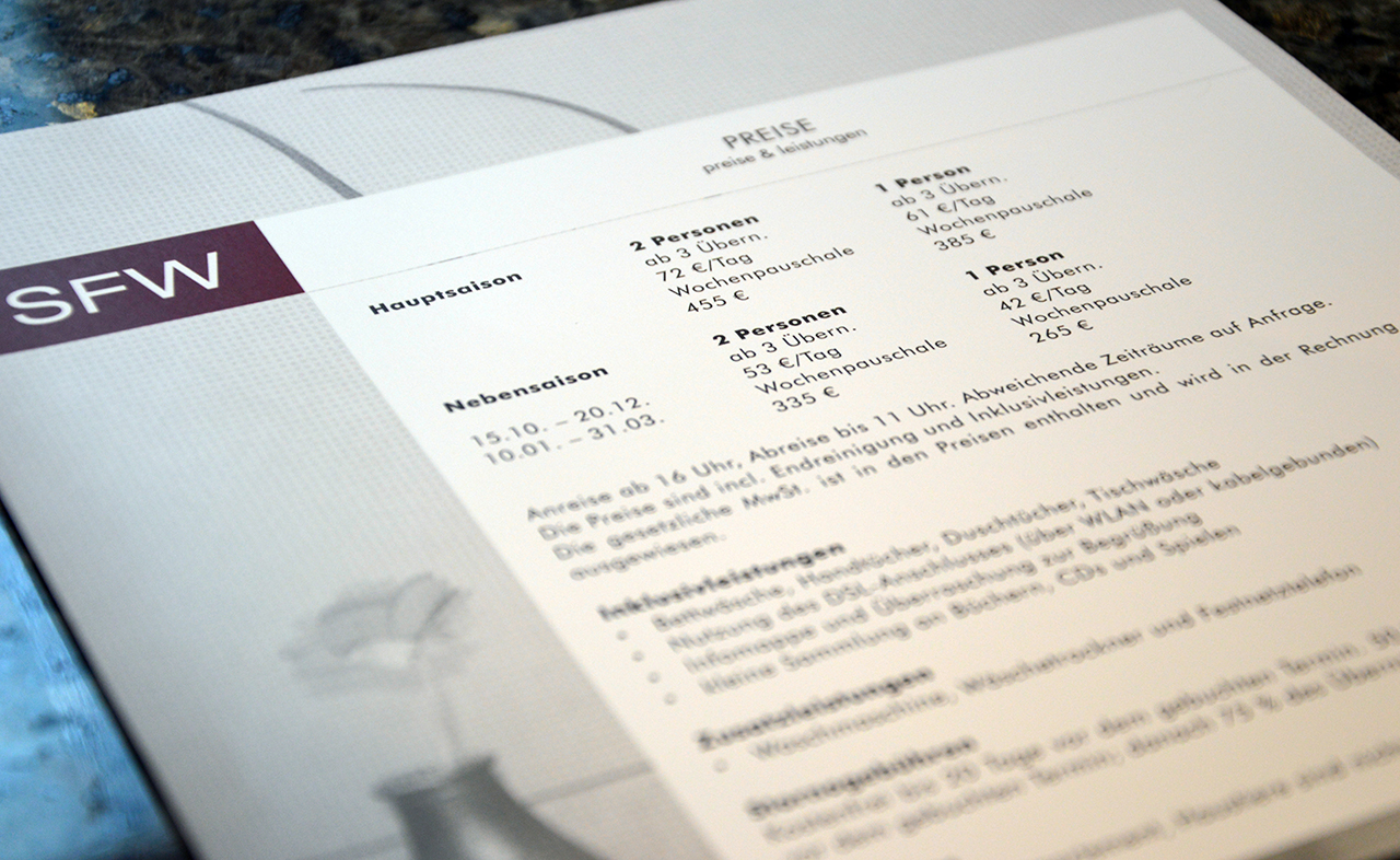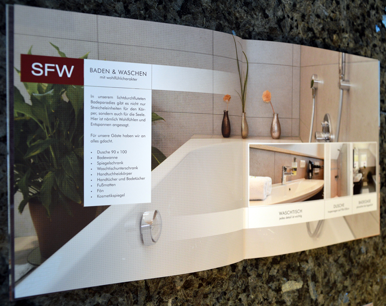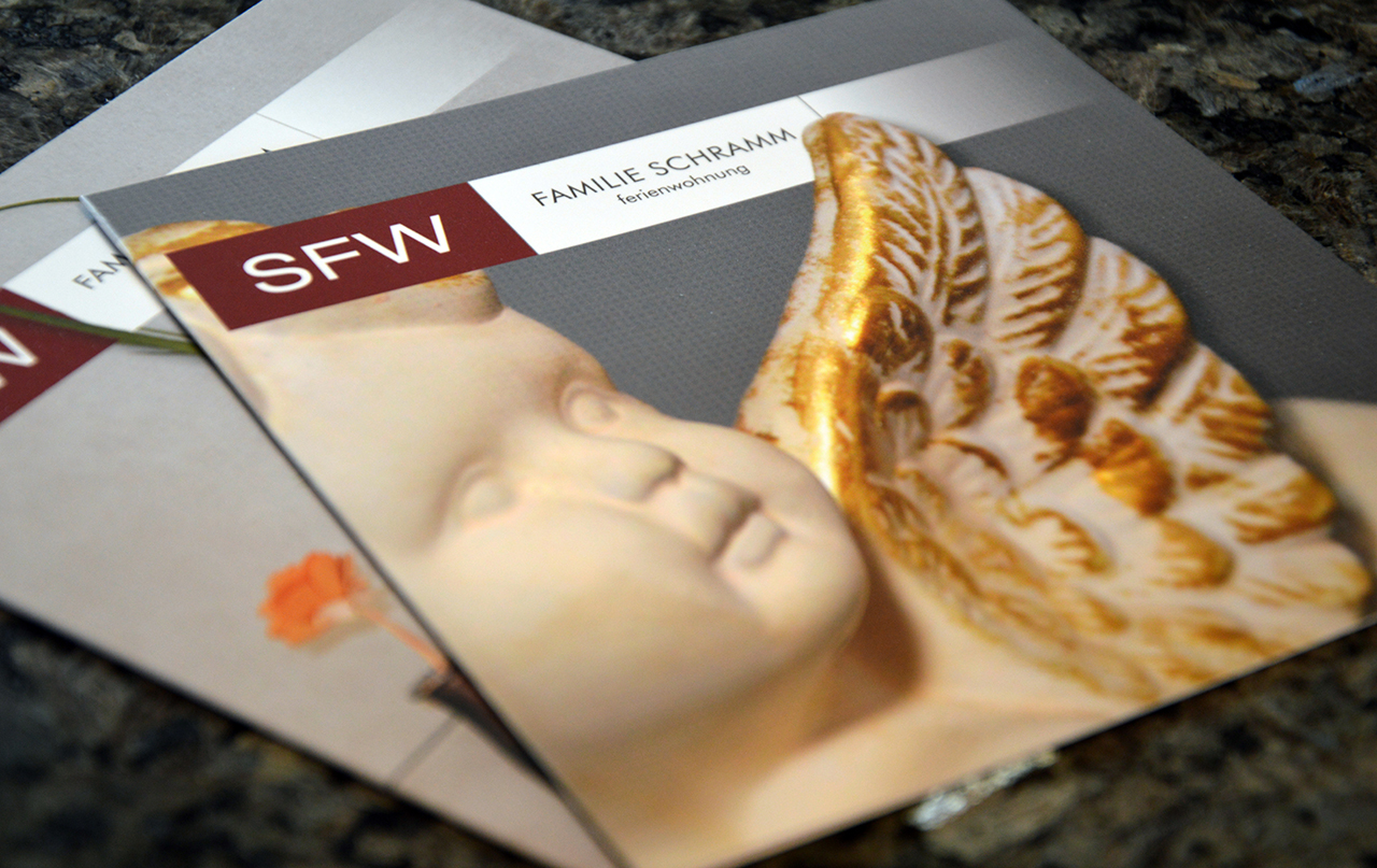 Für Familie Schramm wurden von der Zensys – Medienagentur sämtliche Printmedien in Szene gesetzt. Dabei wurde bei der Produktion größter Wert darauf gelegt, dass sich die Qualität der Ferienwohnung in allen Medien wiederspiegelt. Es wurden beispielsweise alle Printmedien mit einer Softtouchfolie versehen. Somit stellt sich bereits bei der Haptik und dem Anfassen des Mediums das Wohlfühgefühl ein, was einem in der Ferienwohnung erwarten wird.