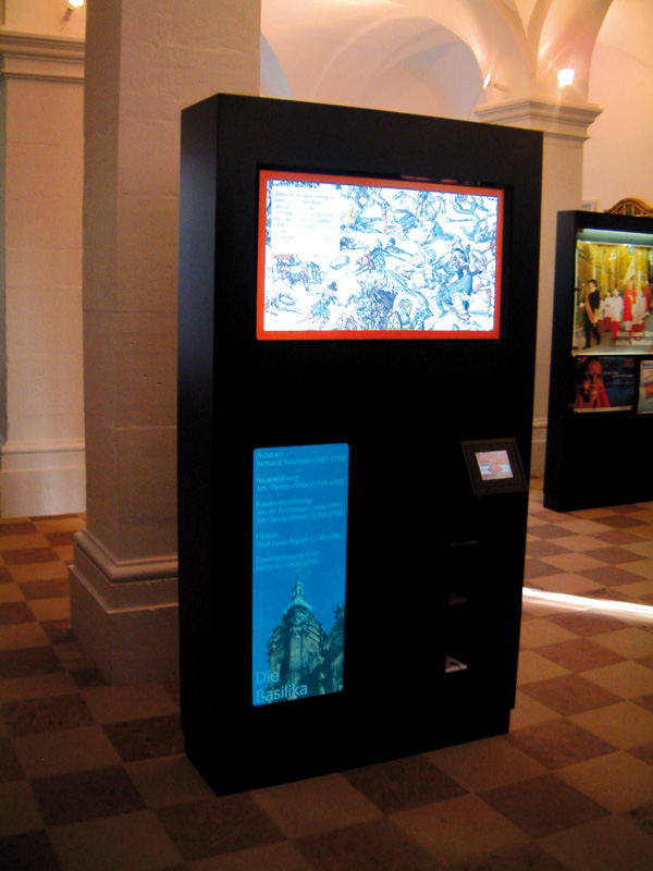 Für das Franziskanerkloster Vierzehnheiligen erstellten wir vier Informationsterminals rundum die Themen Glauben und Kiche, die Franziskaner, die Wallfahrt und die Basilika Vierzehnheiligen. Die in Hard- und Software ausgefeilte multimediale Präsentation lässt sich mittels Touchscreen aüßerst bedienerfreundlich steuern. Hierfür wurde selbstentwickelte Hardware und speziell angepasste Software eingesetzt. Den Wallfahrern werden auf sehr innovative Art die wesentlichen Themen näher gebracht, ohne sie durch überflüssiges technisches Handling abzulenken.